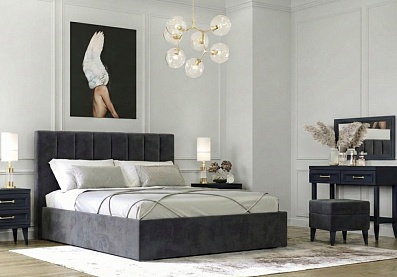 Мягкое, вертикально оформленное изголовье, выглядит современно и элегантно, визуально вытягивает пространство и делает интерьер более гармоничным. Обивка из велюра в универсальном сером оттенке легко вписывается в любой стиль — от минимализма и скандинавского до современного и неоклассики.